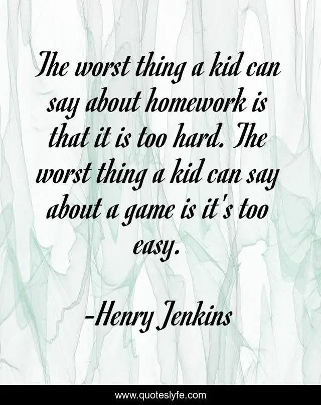 This page presents the quote "The worst thing a kid can say about homework is that it is too hard. The worst thing a kid can say about a game is it's too easy.". Author of this quote is Henry Jenkins. This quote is about students, video-games, games, homework, learning,.
