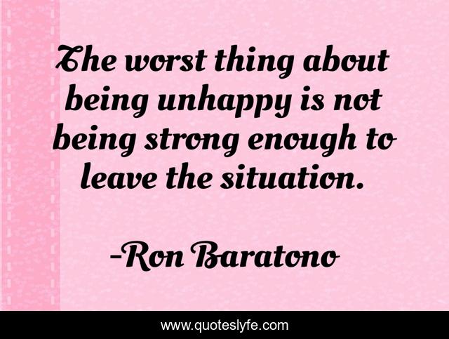 This page presents the quote "The worst thing about being unhappy is not being strong enough to leave the situation.". Author of this quote is Ron Baratono. This quote is about life, strength, unhappy,.