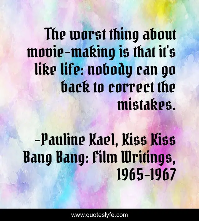 This page presents the quote "The worst thing about movie-making is that it's like life: nobody can go back to correct the mistakes.". Author of this quote is Pauline Kael, Kiss Kiss Bang Bang: Film Writings, 1965-1967. This quote is about movies, life,.
