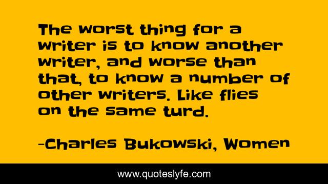 This page presents the quote "The worst thing for a writer is to know another writer, and worse than that, to know a number of other writers. Like flies on the same turd.". Author of this quote is Charles Bukowski, Women. .