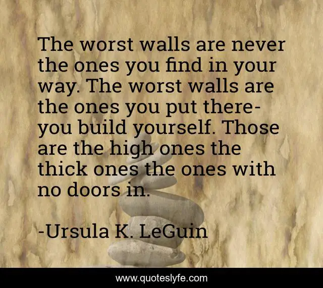 This page presents the quote "The worst walls are never the ones you find in your way. The worst walls are the ones you put there- you build yourself. Those are the high ones the thick ones the ones with no doors in.". Author of this quote is Ursula K. LeGuin. This quote is about self, acceptance,.