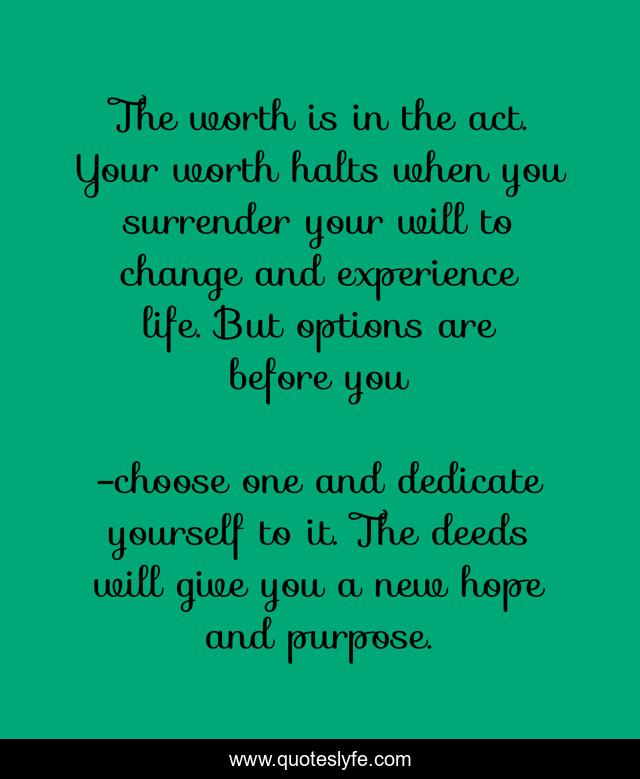 This page presents the quote "The worth is in the act. Your worth halts when you surrender your will to change and experience life. But options are before you". Author of this quote is choose one and dedicate yourself to it. The deeds will give you a new hope and purpose.. This quote is about eragon, christopher paolini,.