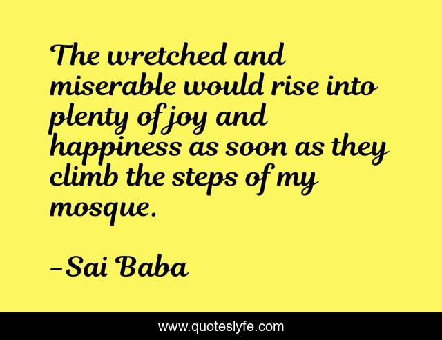 This page presents the quote "The wretched and miserable would rise into plenty of joy and happiness as soon as they climb the steps of my mosque.". Author of this quote is Sai Baba. This quote is about joy, climb, rise,.