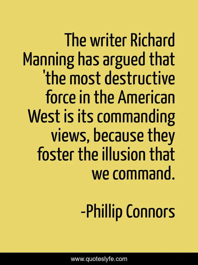 This page presents the quote "The writer Richard Manning has argued that 'the most destructive force in the American West is its commanding views, because they foster the illusion that we command.". Author of this quote is Phillip Connors. This quote is about wilderness, nature, 195, richard-manning, fire, conservation, fire-season,.