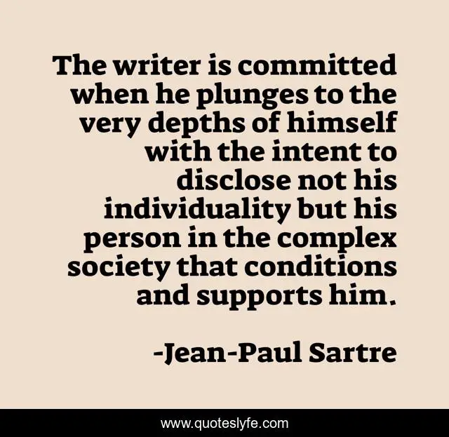 This page presents the quote "The writer is committed when he plunges to the very depths of himself with the intent to disclose not his individuality but his person in the complex society that conditions and supports him.". Author of this quote is Jean-Paul Sartre. This quote is about writers, writing,.