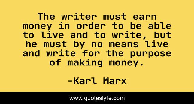 This page presents the quote "The writer must earn money in order to be able to live and to write, but he must by no means live and write for the purpose of making money.". Author of this quote is Karl Marx. This quote is about live, making money, purpose,.