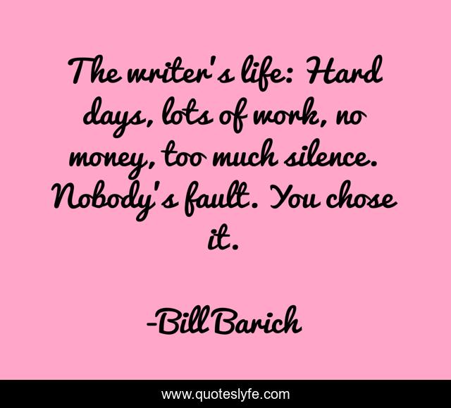 This page presents the quote "The writer's life: Hard days, lots of work, no money, too much silence. Nobody's fault. You chose it.". Author of this quote is Bill Barich. .