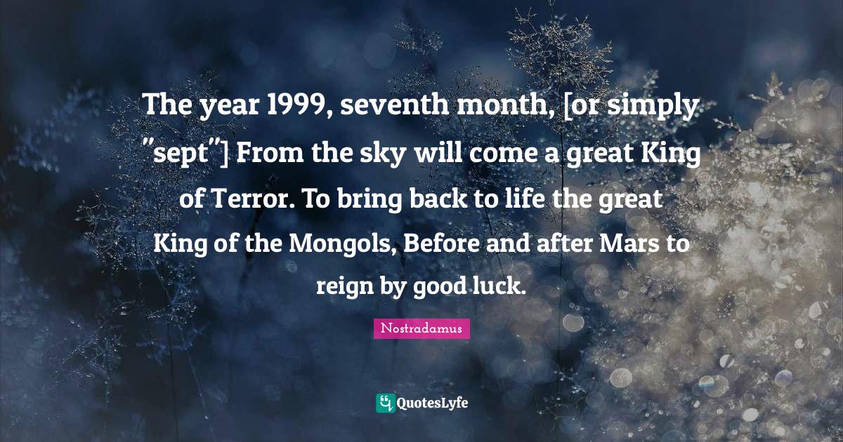 This page presents the quote "The year 1999, seventh month, [or simply "sept"] From the sky will come a great King of Terror. To bring back to life the great King of the Mongols, Before and after Mars to reign by good luck.". Author of this quote is Nostradamus. This quote is about kings, before and after, good luck, life, reign, sky, mars, terror, mongols,.