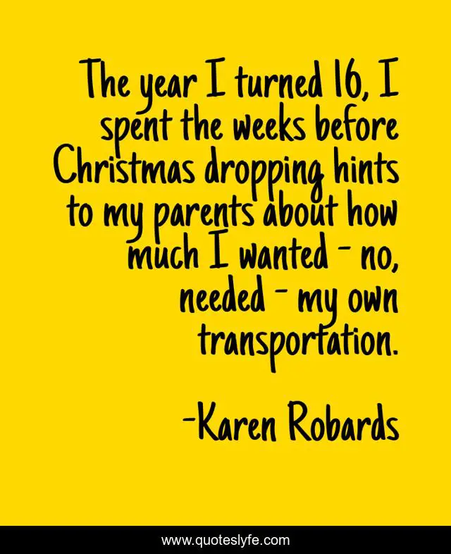 This page presents the quote "The year I turned 16, I spent the weeks before Christmas dropping hints to my parents about how much I wanted - no, needed - my own transportation.". Author of this quote is Karen Robards. This quote is about parents, transportation,.