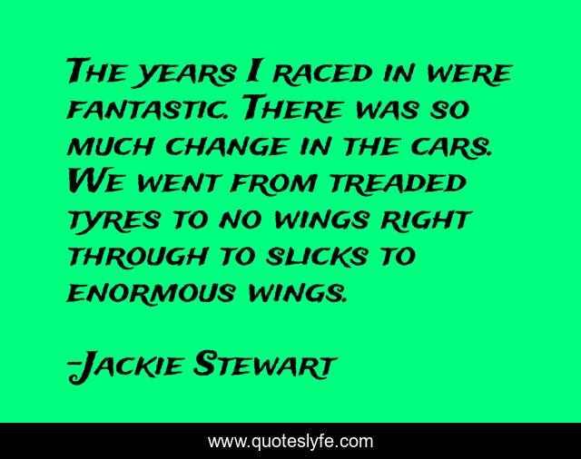 This page presents the quote "The years I raced in were fantastic. There was so much change in the cars. We went from treaded tyres to no wings right through to slicks to enormous wings.". Author of this quote is Jackie Stewart. This quote is about through, wings, change,.
