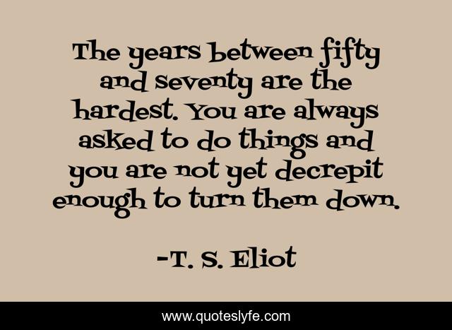 This page presents the quote "The years between fifty and seventy are the hardest. You are always asked to do things and you are not yet decrepit enough to turn them down.". Author of this quote is T. S. Eliot. This quote is about age, birthdays,.