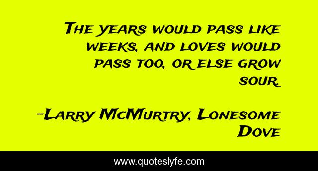 This page presents the quote "The years would pass like weeks, and loves would pass too, or else grow sour.". Author of this quote is Larry McMurtry, Lonesome Dove. This quote is about love, like, years, thought, thought-to-ponder, passed, affection,.