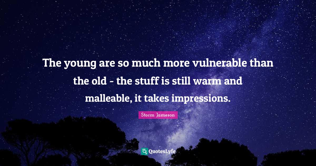 This page presents the quote "The young are so much more vulnerable than the old - the stuff is still warm and malleable, it takes impressions.". Author of this quote is Storm Jameson. This quote is about stuff, warm, vulnerable, youth, young,.