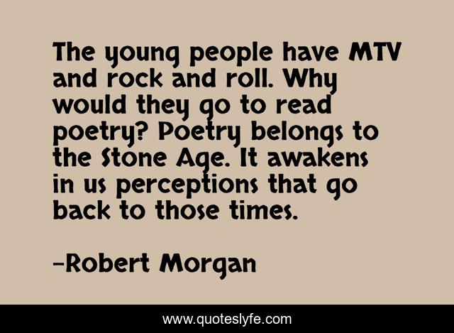 This page presents the quote "The young people have MTV and rock and roll. Why would they go to read poetry? Poetry belongs to the Stone Age. It awakens in us perceptions that go back to those times.". Author of this quote is Robert Morgan. This quote is about rock and roll, poetry,.