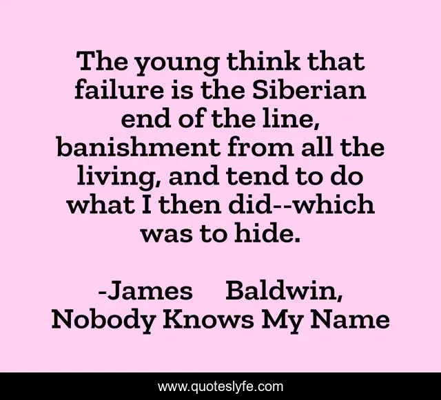 This page presents the quote "The young think that failure is the Siberian end of the line, banishment from all the living, and tend to do what I then did--which was to hide.". Author of this quote is James Baldwin, Nobody Knows My Name. This quote is about failure, 155,.