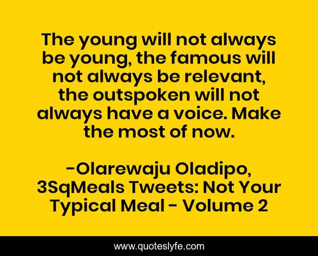 This page presents the quote "The young will not always be young, the famous will not always be relevant, the outspoken will not always have a voice. Make the most of now.". Author of this quote is Olarewaju Oladipo, 3SqMeals Tweets: Not Your Typical Meal - Volume 2. This quote is about fame-and-attitude, time-management, voice-within, youth-is-temporary,.
