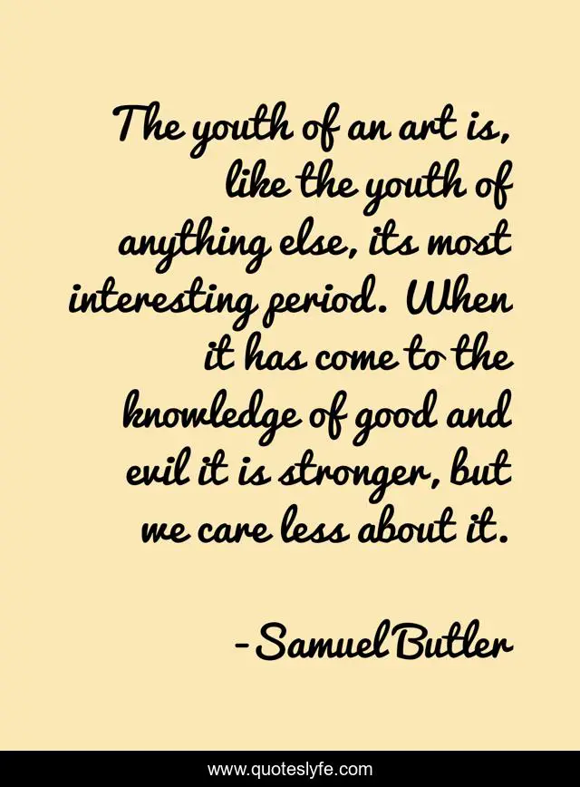 This page presents the quote "The youth of an art is, like the youth of anything else, its most interesting period. When it has come to the knowledge of good and evil it is stronger, but we care less about it.". Author of this quote is Samuel Butler. This quote is about good, art, evil,.