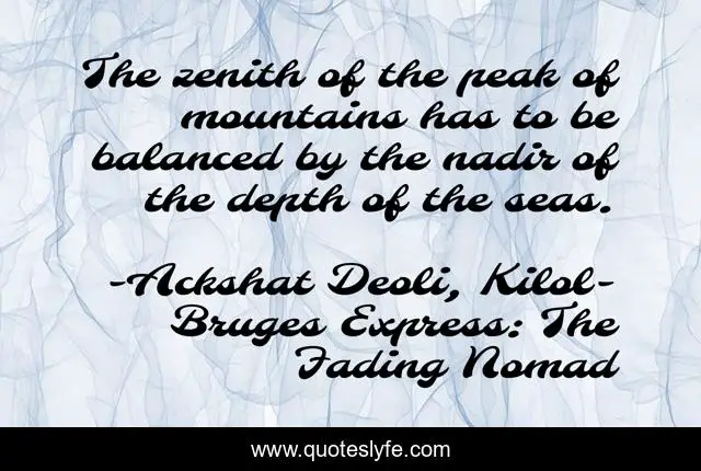This page presents the quote "The zenith of the peak of mountains has to be balanced by the nadir of the depth of the seas.". Author of this quote is Ackshat Deoli, Kilol-Bruges Express: The Fading Nomad. This quote is about life, life-coach, motivational, zen, motivation, optimistic, inspirational, zen-and-the-art-of-happiness, enthusiasm,.