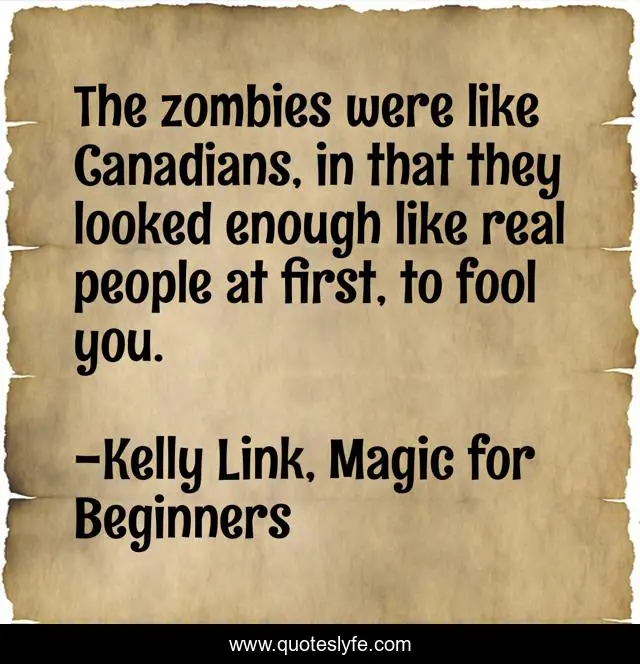 This page presents the quote "The zombies were like Canadians, in that they looked enough like real people at first, to fool you.". Author of this quote is Kelly Link, Magic for Beginners. This quote is about canada, canadian, zombies, canadians,.