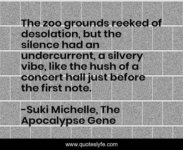This page presents the quote "The zoo grounds reeked of desolation, but the silence had an undercurrent, a silvery vibe, like the hush of a concert hall just before the first note.". Author of this quote is Suki Michelle, The Apocalypse Gene. This quote is about ya, dystopia, urban-fantasy,.
