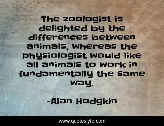 This page presents the quote "The zoologist is delighted by the differences between animals, whereas the physiologist would like all animals to work in fundamentally the same way.". Author of this quote is Alan Hodgkin. This quote is about zoology, science, physiologist, animals, nobel-laureate,.