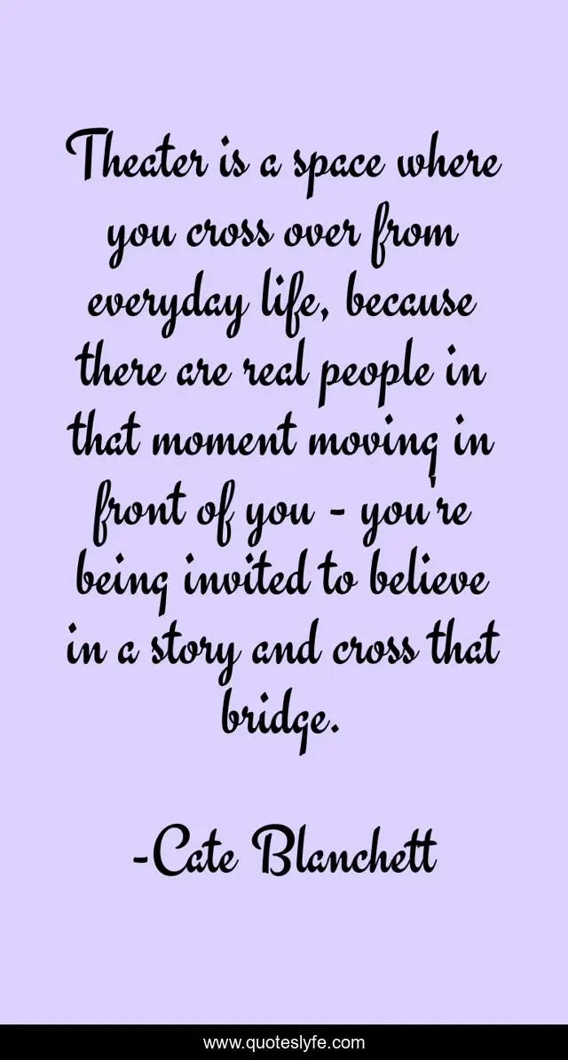 This page presents the quote "Theater is a space where you cross over from everyday life, because there are real people in that moment moving in front of you - you're being invited to believe in a story and cross that bridge.". Author of this quote is Cate Blanchett. This quote is about life, believe, moving,.