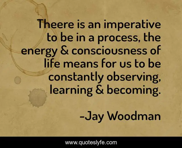 This page presents the quote "Theere is an imperative to be in a process, the energy & consciousness of life means for us to be constantly observing, learning & becoming.". Author of this quote is Jay Woodman. This quote is about consciousness, process, energy, imperative-for-life, observe, learn, become,.