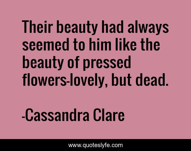 This page presents the quote "Their beauty had always seemed to him like the beauty of pressed flowers-lovely, but dead.". Author of this quote is Cassandra Clare. This quote is about clockwork-angel, will-herondale, vampires,.