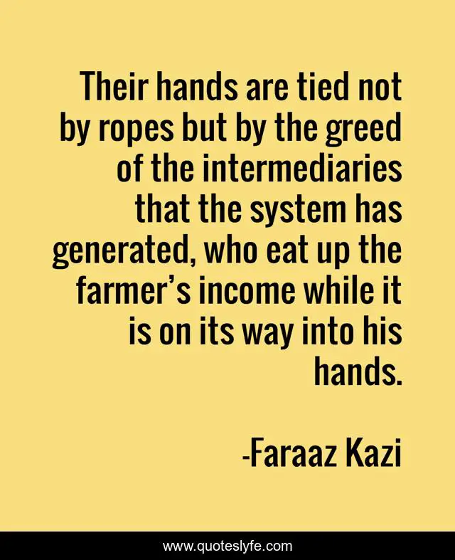 This page presents the quote "Their hands are tied not by ropes but by the greed of the intermediaries that the system has generated, who eat up the farmer’s income while it is on its way into his hands.". Author of this quote is Faraaz Kazi. This quote is about agriculture, injustice, farmers,.