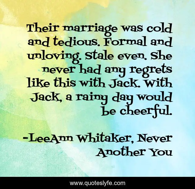This page presents the quote "Their marriage was cold and tedious. Formal and unloving. Stale even. She never had any regrets like this with Jack. With Jack, a rainy day would be cheerful.". Author of this quote is LeeAnn Whitaker, Never Another You. This quote is about romance-book, romance-love-heartache, love-story, never-another-you,.
