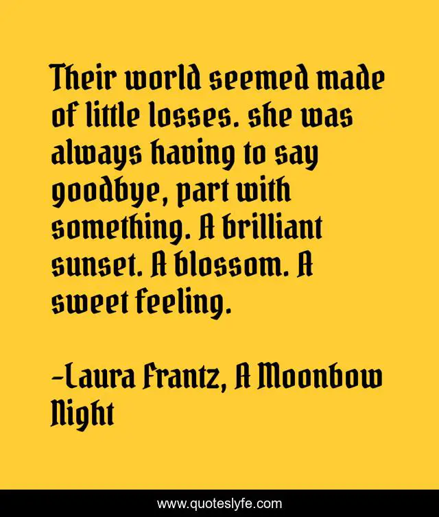 This page presents the quote "Their world seemed made of little losses. she was always having to say goodbye, part with something. A brilliant sunset. A blossom. A sweet feeling.". Author of this quote is Laura Frantz, A Moonbow Night. This quote is about loss, love, affection,.