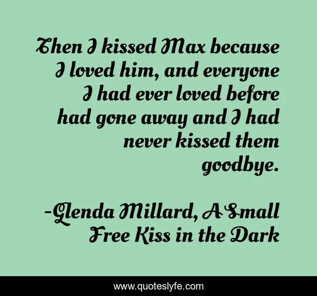This page presents the quote "Then I kissed Max because I loved him, and everyone I had ever loved before had gone away and I had never kissed them goodbye.". Author of this quote is Glenda Millard, A Small Free Kiss in the Dark. This quote is about goodbye, love, kiss, affection,.