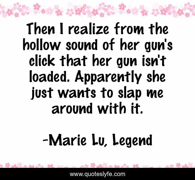This page presents the quote "Then I realize from the hollow sound of her gun's click that her gun isn't loaded. Apparently she just wants to slap me around with it.". Author of this quote is Marie Lu, Legend. This quote is about daniel-wing, june-iparis, day,.
