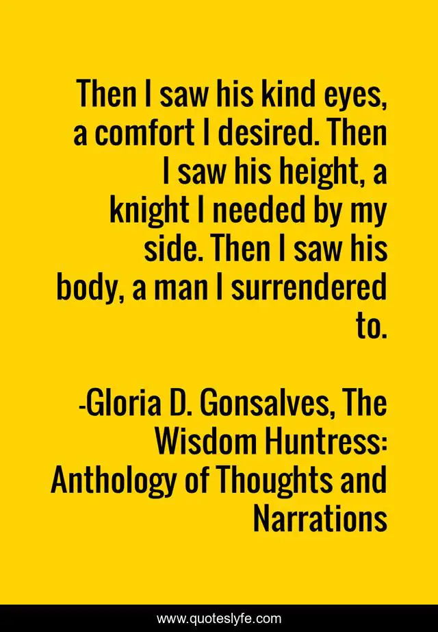 This page presents the quote "Then I saw his kind eyes, a comfort I desired. Then I saw his height, a knight I needed by my side. Then I saw his body, a man I surrendered to.". Author of this quote is Gloria D. Gonsalves, The Wisdom Huntress: Anthology of Thoughts and Narrations. This quote is about quote, quotes,.