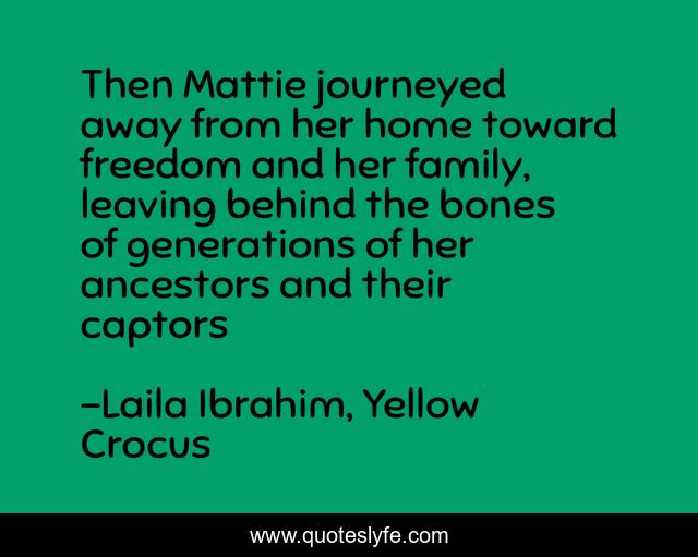This page presents the quote "Then Mattie journeyed away from her home toward freedom and her family, leaving behind the bones of generations of her ancestors and their captors". Author of this quote is Laila Ibrahim, Yellow Crocus. .