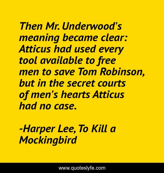 This page presents the quote "Then Mr. Underwood's meaning became clear: Atticus had used every tool available to free men to save Tom Robinson, but in the secret courts of men's hearts Atticus had no case.". Author of this quote is Harper Lee, To Kill a Mockingbird. This quote is about justice, court, lawyers, racism,.