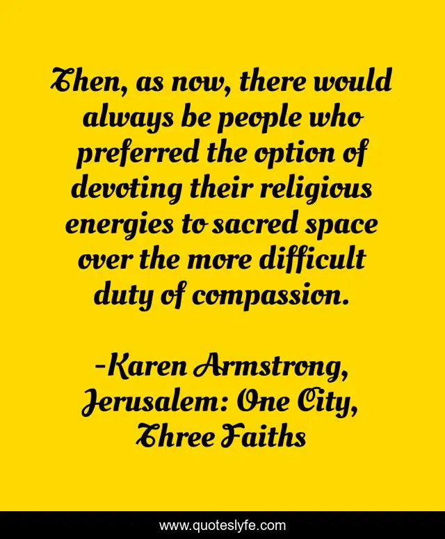 This page presents the quote "Then, as now, there would always be people who preferred the option of devoting their religious energies to sacred space over the more difficult duty of compassion.". Author of this quote is Karen Armstrong, Jerusalem: One City, Three Faiths. This quote is about compassion, religion, sacred-space,.