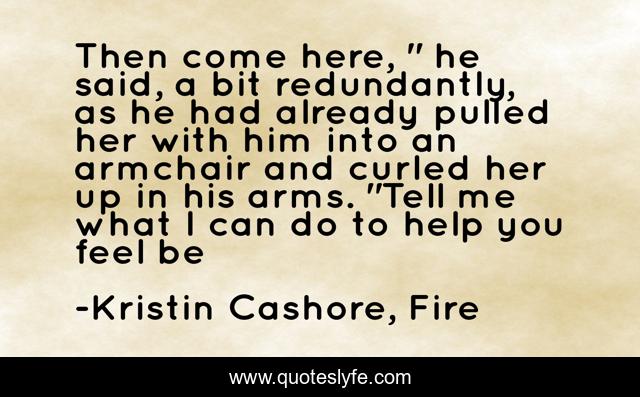 This page presents the quote "Then come here, " he said, a bit redundantly, as he had already pulled her with him into an armchair and curled her up in his arms. "Tell me what I can do to help you feel be". Author of this quote is Kristin Cashore, Fire. .