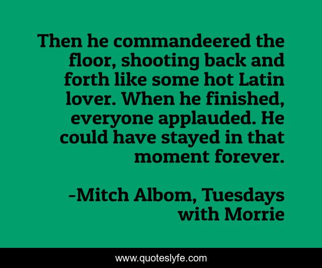 This page presents the quote "Then he commandeered the floor, shooting back and forth like some hot Latin lover. When he finished, everyone applauded. He could have stayed in that moment forever.". Author of this quote is Mitch Albom, Tuesdays with Morrie. This quote is about emotion, forever, love, applause, dance, moment, affection,.