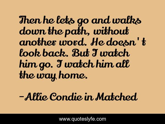 This page presents the quote "Then he lets go and walks down the path, without another word. He doesn't look back. But I watch him go. I watch him all the way home.". Author of this quote is Allie Condie in Matched. This quote is about longing, endings, matched-1,.