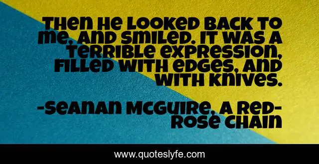 This page presents the quote "Then he looked back to me, and smiled. It was a terrible expression, filled with edges, and with knives.". Author of this quote is Seanan McGuire, A Red-Rose Chain. This quote is about smile, knives, happiness,.