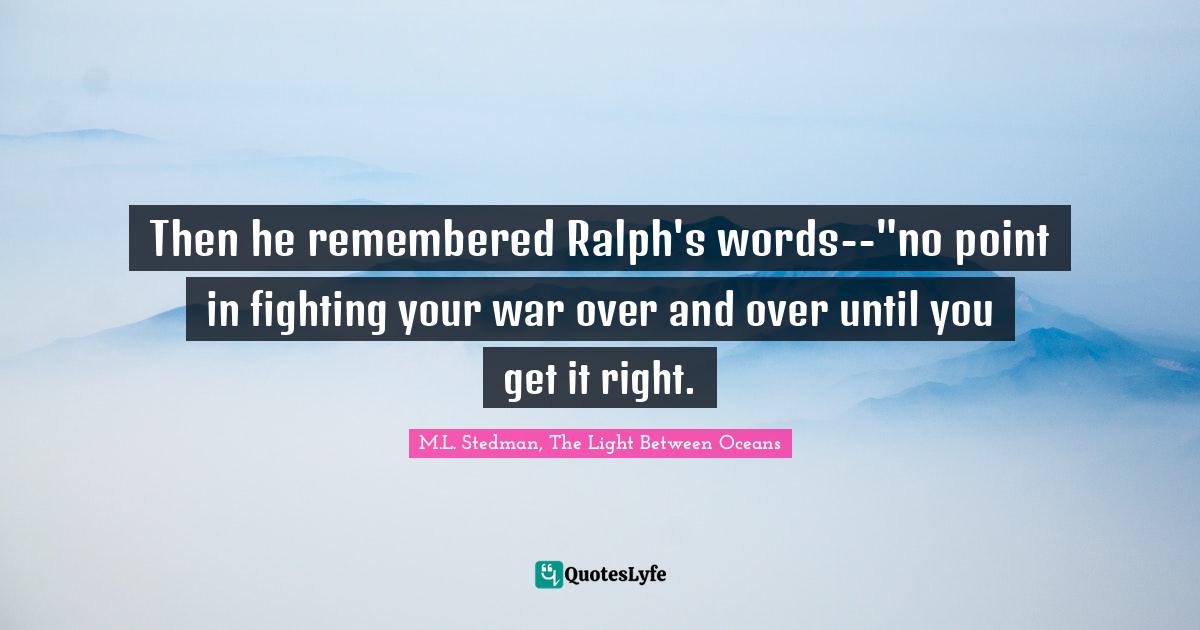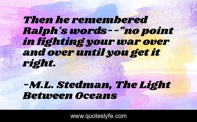 This page presents the quote "Then he remembered Ralph's words--"no point in fighting your war over and over until you get it right.". Author of this quote is M.L. Stedman, The Light Between Oceans. .