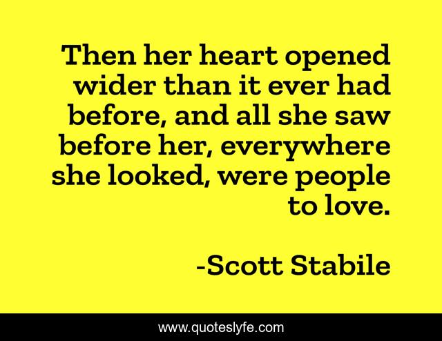 This page presents the quote "Then her heart opened wider than it ever had before, and all she saw before her, everywhere she looked, were people to love.". Author of this quote is Scott Stabile. This quote is about compassion, heart, life, love, affection,.