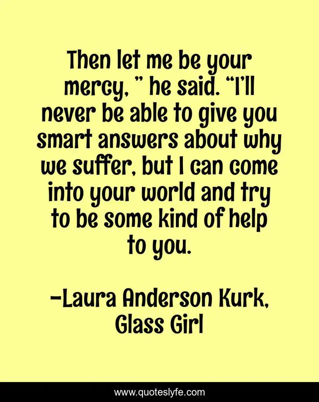 This page presents the quote "Then let me be your mercy, ” he said. “I’ll never be able to give you smart answers about why we suffer, but I can come into your world and try to be some kind of help to you.". Author of this quote is Laura Anderson Kurk, Glass Girl. This quote is about relationships, faith, love, teen-fiction, glass-girl, god, laura-anderson-kurk, ya-fiction, romance,.