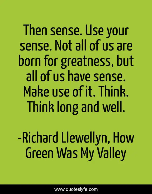 This page presents the quote "Then sense. Use your sense. Not all of us are born for greatness, but all of us have sense. Make use of it. Think. Think long and well.". Author of this quote is Richard Llewellyn, How Green Was My Valley. This quote is about enthusiasm, philosophical, thought-provoking, inspirational,.