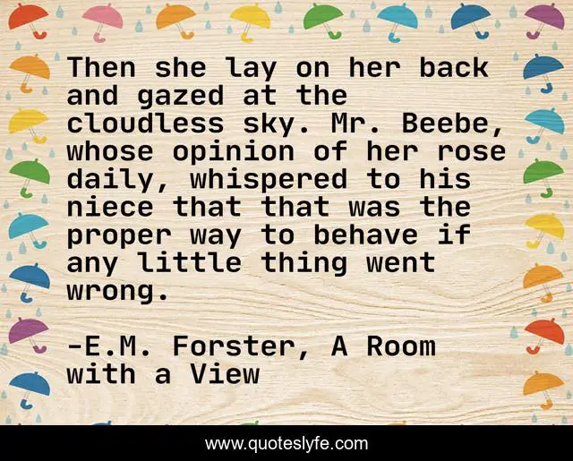 Then she lay on her back and gazed at the cloudless sky. Mr. Beebe, whose opinion of her rose daily, whispered to his niece that that was the proper way to behave if any little thing went wrong.