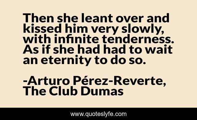 This page presents the quote "Then she leant over and kissed him very slowly, with infinite tenderness. As if she had had to wait an eternity to do so.". Author of this quote is Arturo Pérez-Reverte, The Club Dumas. This quote is about the-club-dumas, love, kiss, affection, arturo-pérez-reverte,.