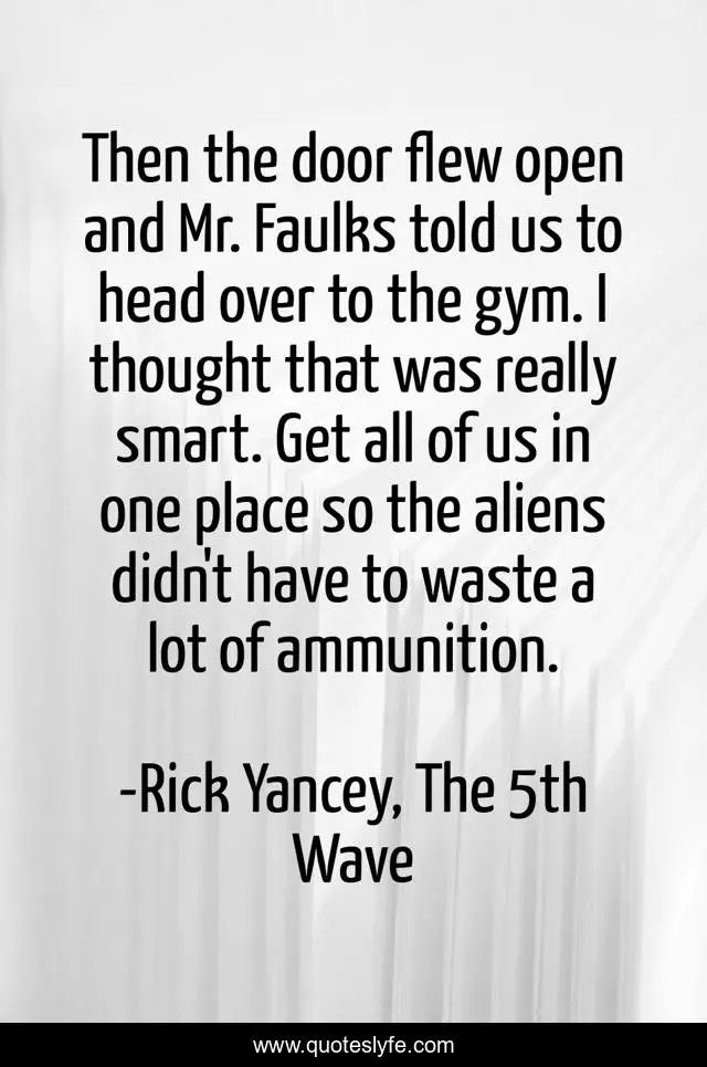 This page presents the quote "Then the door flew open and Mr. Faulks told us to head over to the gym. I thought that was really smart. Get all of us in one place so the aliens didn't have to waste a lot of ammunition.". Author of this quote is Rick Yancey, The 5th Wave. This quote is about 5th-wave, school, alien-invasion,.