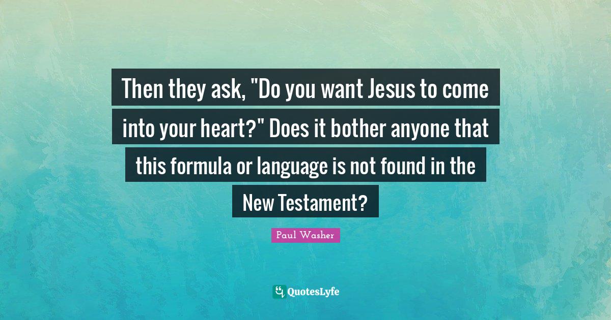 This page presents the quote "Then they ask, "Do you want Jesus to come into your heart?" Does it bother anyone that this formula or language is not found in the New Testament?". Author of this quote is Paul Washer. This quote is about found, new testament, language, jesus, doe, bother, heart,.