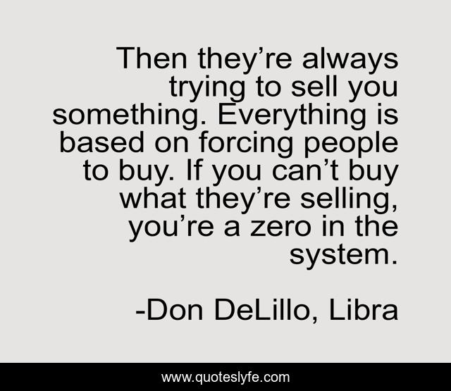 This page presents the quote "Then they’re always trying to sell you something. Everything is based on forcing people to buy. If you can’t buy what they’re selling, you’re a zero in the system.". Author of this quote is Don DeLillo, Libra. This quote is about society, capitalism,.